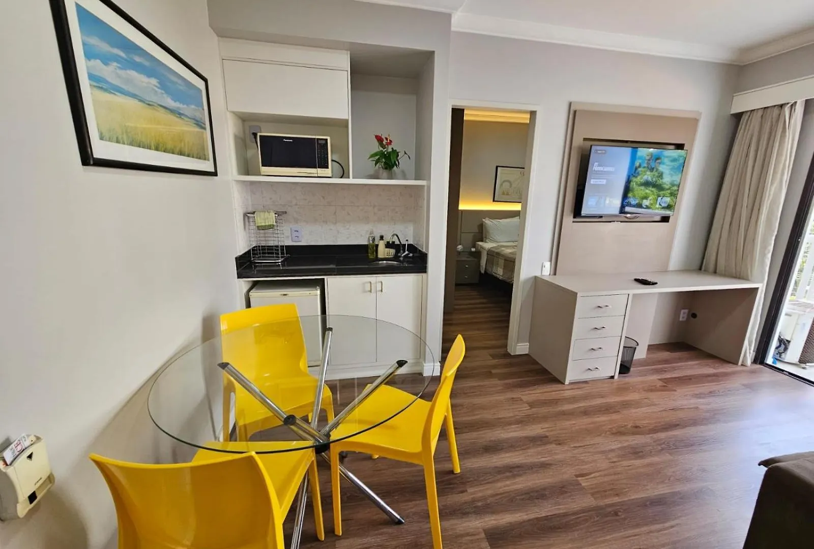 El Flat Em Moema Apartamento cuenta con habitaciones con un balcón, una cocina pequeña y un sofá, además de una cocina pequeña. El establecimiento tiene capacidad para 2 personas.